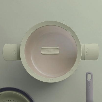 - CONSTRUCTION: Stockpot with Multifunctional Glass Lid, Sage. Made from recycled Aluminum with CeraGreen non-stick ceramic coating. Comes with Stay-cool two-handle for a safe and comfortable grip. Hanging loop that allows for easy storage and minimal kitchen space. Integrated straining function and special knob on the lid for spoon rest to keep your kitchen clean while cooking. The silicone rim around the lid is to prevent rattling, also drip-free pouring.
